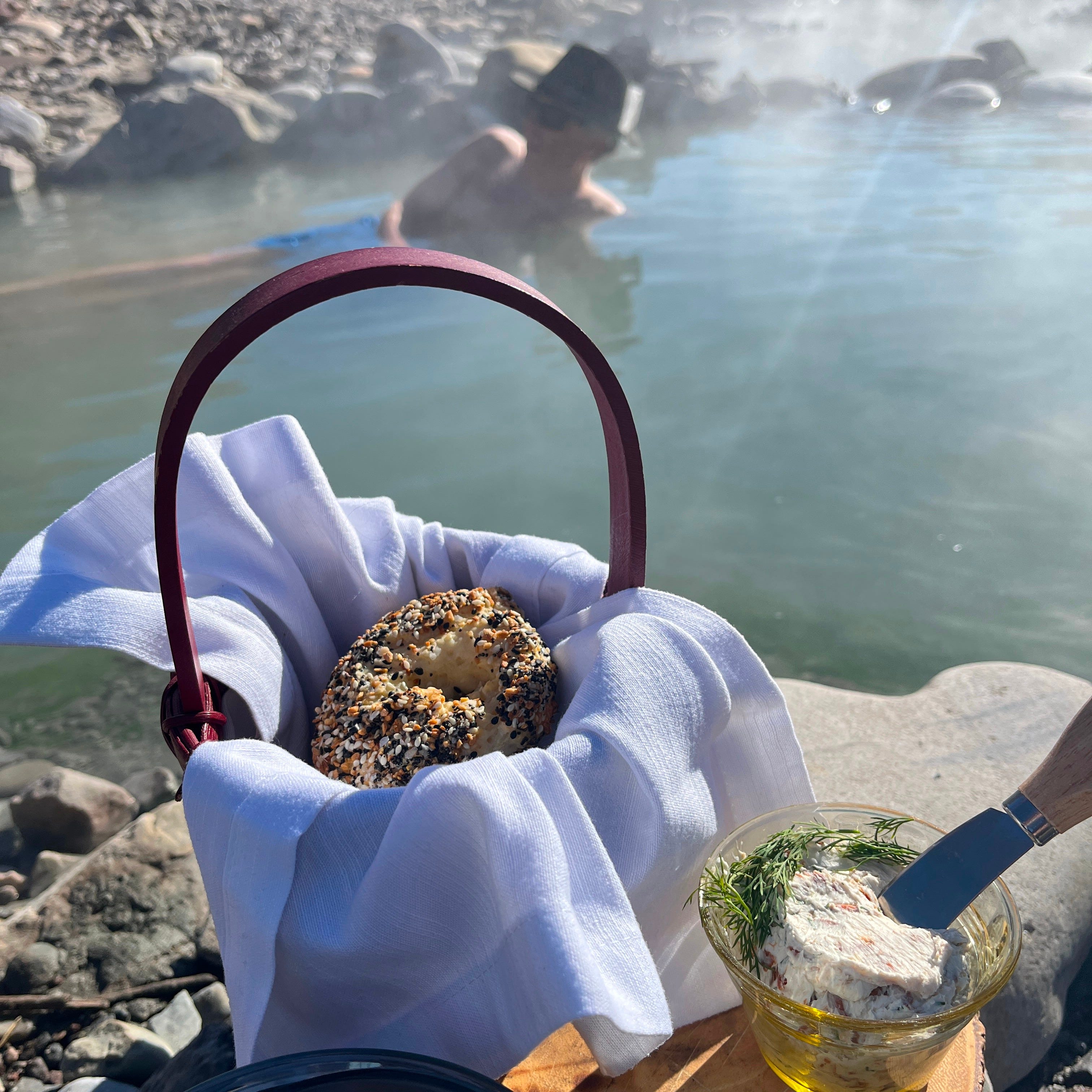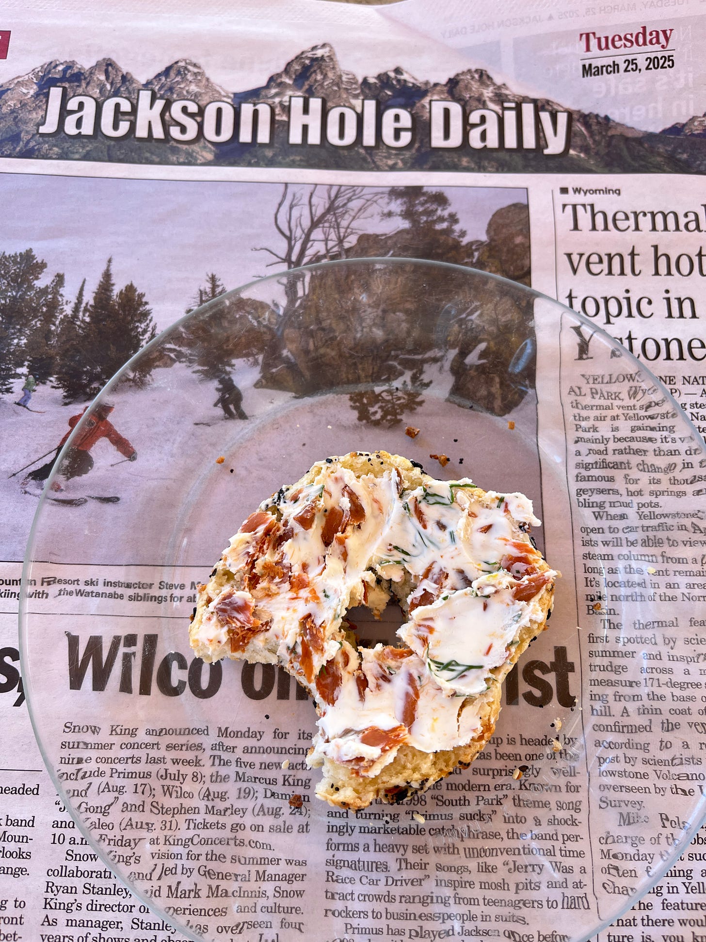 For our morning excursion, I made some bagels using the Skinnytaste recipe. These are not authentic chewy bagels, but delicious and biscuit-like with a tender crumb. And they go together very quickly, which is a big plus for a morning bread. I also had some candied salmon on hand that Rose brought back from Canada last week, so I smashed that into some cream cheese with dill and lemon zest. It was a perfect al fresco breakfast with a great big coffee in an insulated hipster cup.