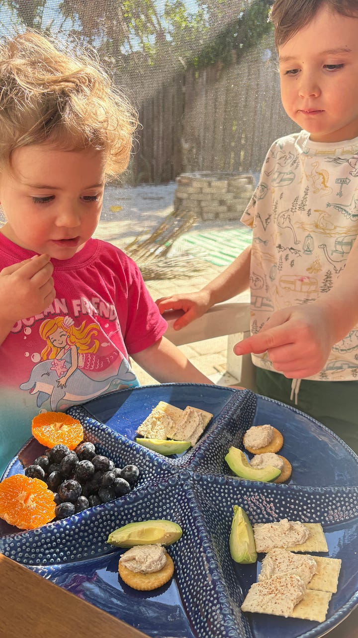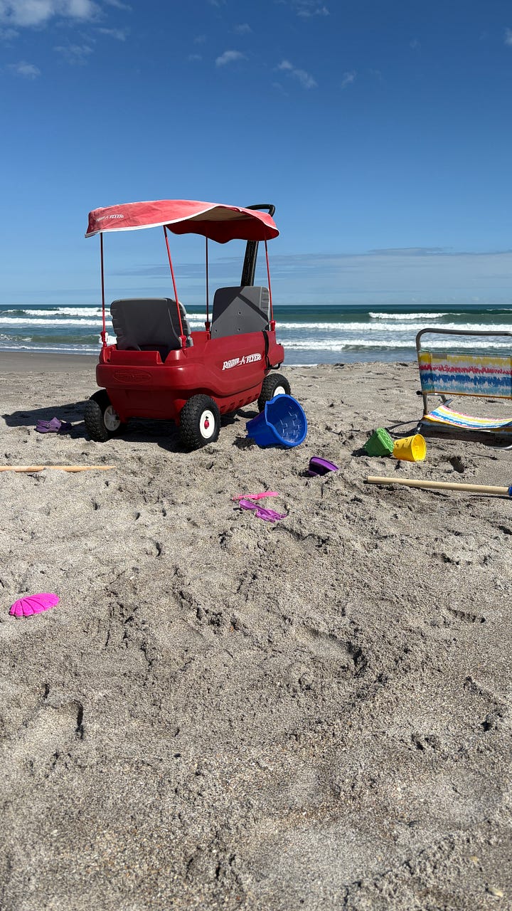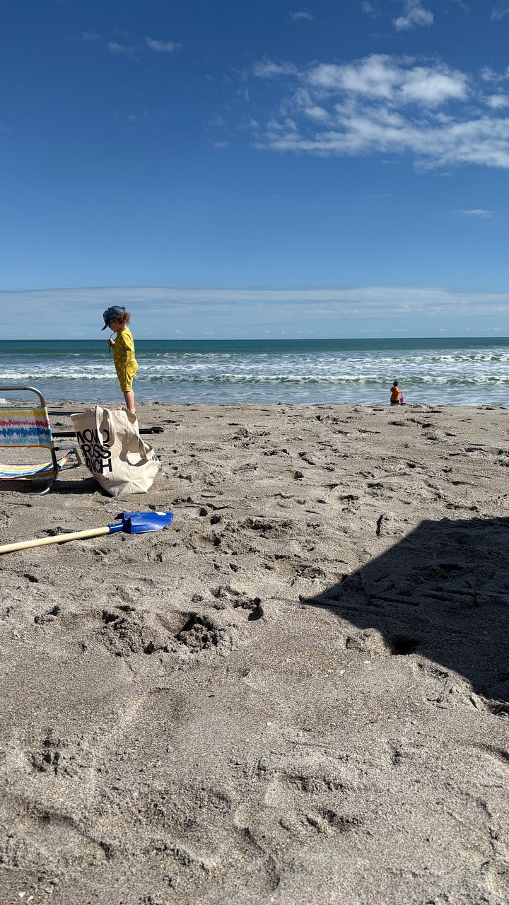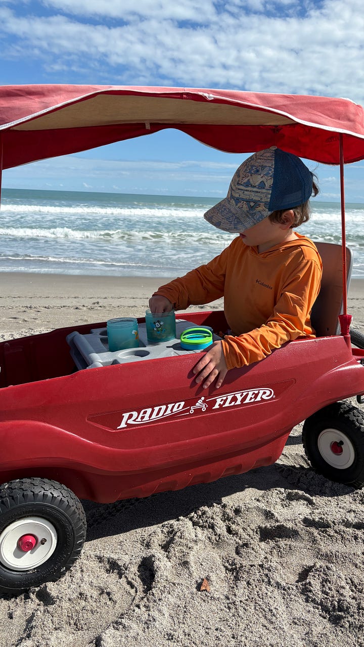 What we have found with our young visitors is that there is always a mealtime on the horizon. When they first get up, someone makes them First Breakfast, which is an omelette, pancakes, or a bagel with lox. That holds them over for about an hour until Second Breakfast. After that, there is Snack, which precedes Lunch. Sometimes there is a Second Lunch, but not usually. They are often out and about, busy and engaged. Any beach outing requires multiple snacks and drinks, and Kirk made the happy discovery that the beach wagon has a built-in table and the seagulls steer clear of it.
