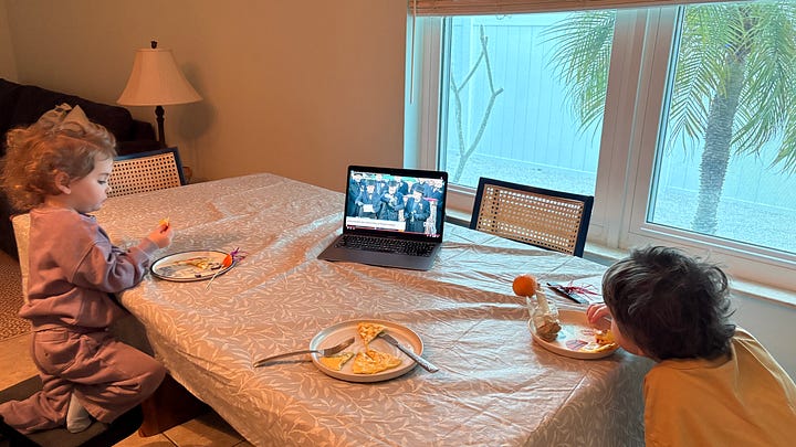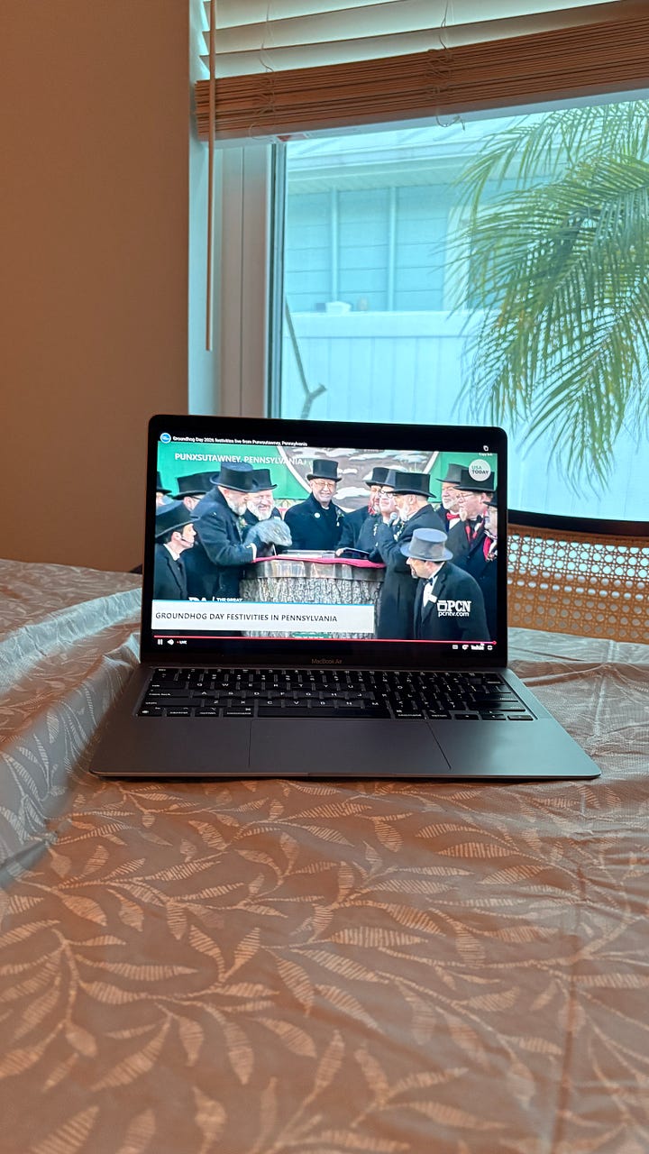 But the weekend was too short. They had to get back to Miami and work and school. And to listen for the Groundhog’s Prognostication the next morning. Force of habit, I awoke before dawn on Feb 2 and put on the live feed from Gobbler’s Knob and watched it with the kids. Surprise—six more weeks of winter!