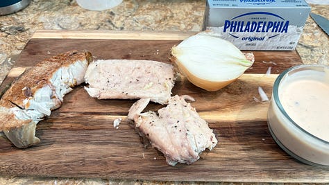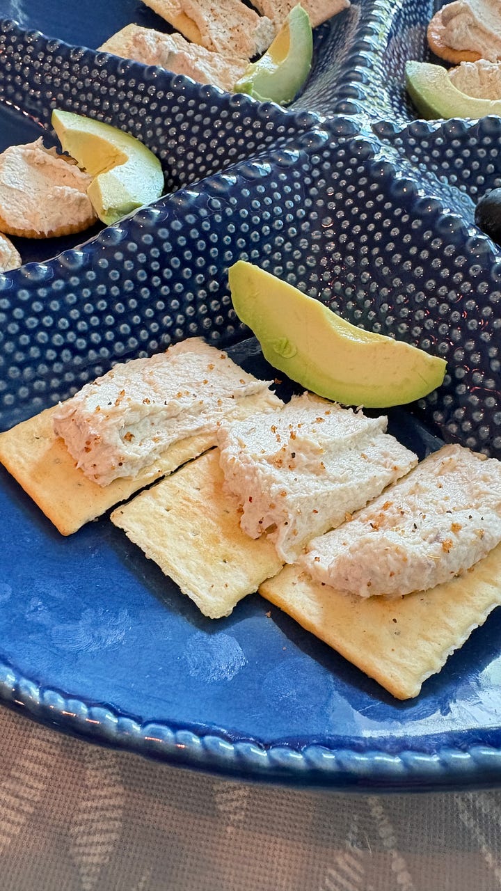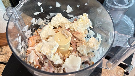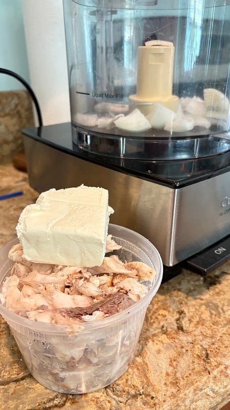 Here’s a recipe from yesterday’s Second Breakfast: homemade Fish Dip made from our pompano dinner, and some smoked kingfish from our favorite Seafood Atlantic market. It was easy to mix up in the Cuisinart, with minced onion, cream cheese, and a little bit of Remoulade. Try it out next time you have some leftover fish. It’s a great appetizer for Happy Hour—or Second Breakfast.