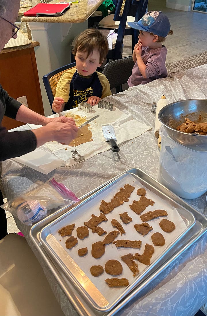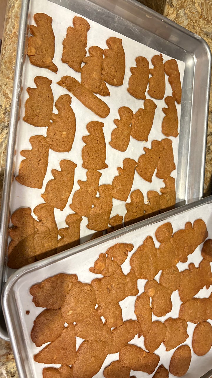 My sister Mary visited us and dropped off some gingerbread cookie mix, so we fashioned some groundhog cookies for the occasion. It was a challenging task, but even the misshapen ones were very tasty.