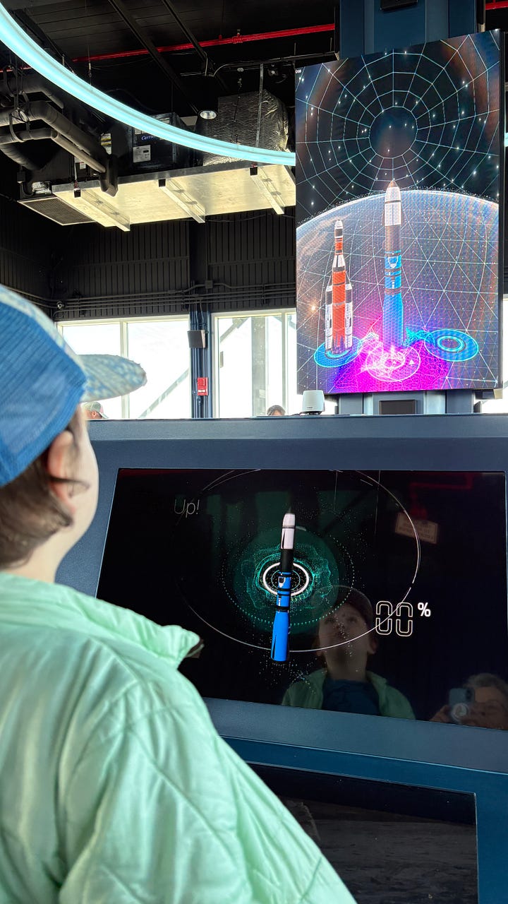 The next day, we toured the Kennedy Space Center and saw where all those rocket ships are coming from. We even saw the Artemis in its launchpad, the ship that will be crewed to head toward the moon for the first time since 1972. Kirk enjoyed working at a simulator and designing and launching his own rocket and Iris most enjoyed the sight of the golden astronaut. Get those kids into Space Camp!