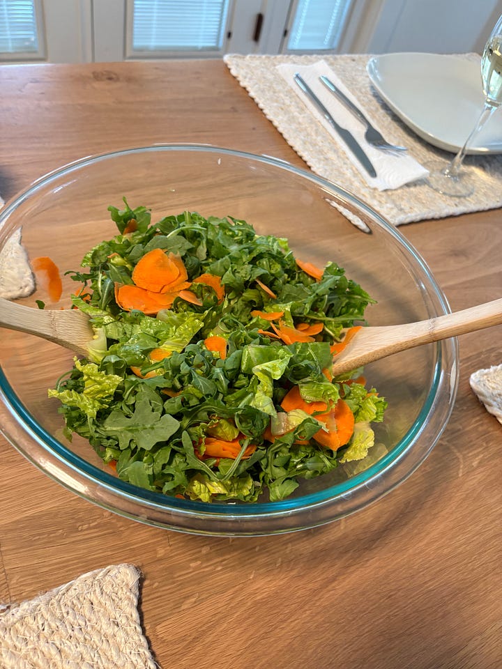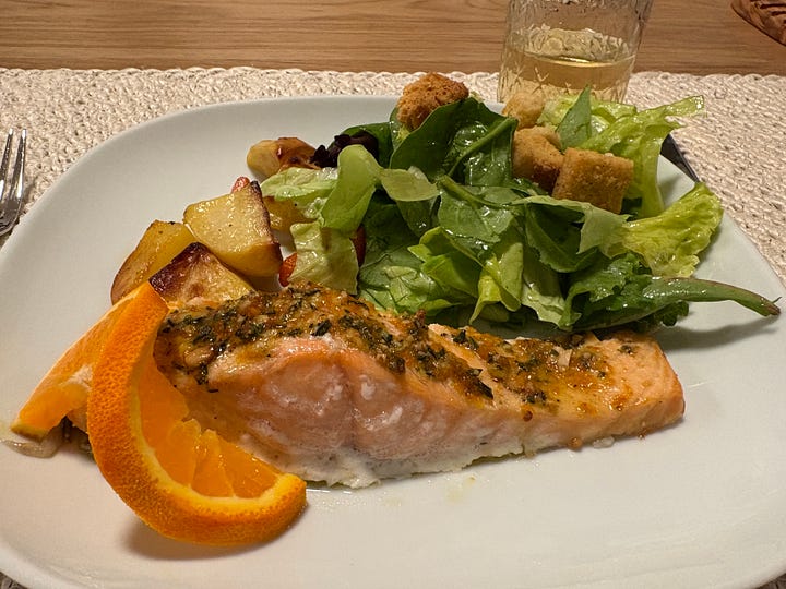 Dinner that night back at home took only slightly longer than the previous night. And I was allowed to help this time, prepping potatoes and carrots for oven roasting, making our family’s favorite Orange Thyme Pesto for salmon, and putting together a green salad, again with a light lemon vinaigrette. The treat was the bottle of Chablis that Joe picked up at Boulder Wine Merchant.