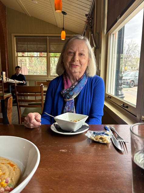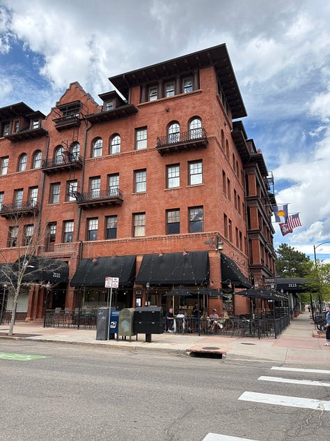 The next day, I had a lunch date with my friend Kristin, who lives in a tiny home behind her daughter’s home in Boulder. Joe dropped me off there, and we Ubered over to the Hotel Boulderado, a short walk from the Pearl Street pedestrian mall. Kristin and I met on the playground during our grandkids' weekly playdates, when their mommies took them for some outdoor fun, and we went along. The grandmas had fun too, and we called ourselves the Senior Playground Players. We toted snacks and bevs (even some adult bevs) separate from the juice boxes. Another granny from our group is Liz, from England, and we so enjoyed our time that we still get together for monthly video chats.