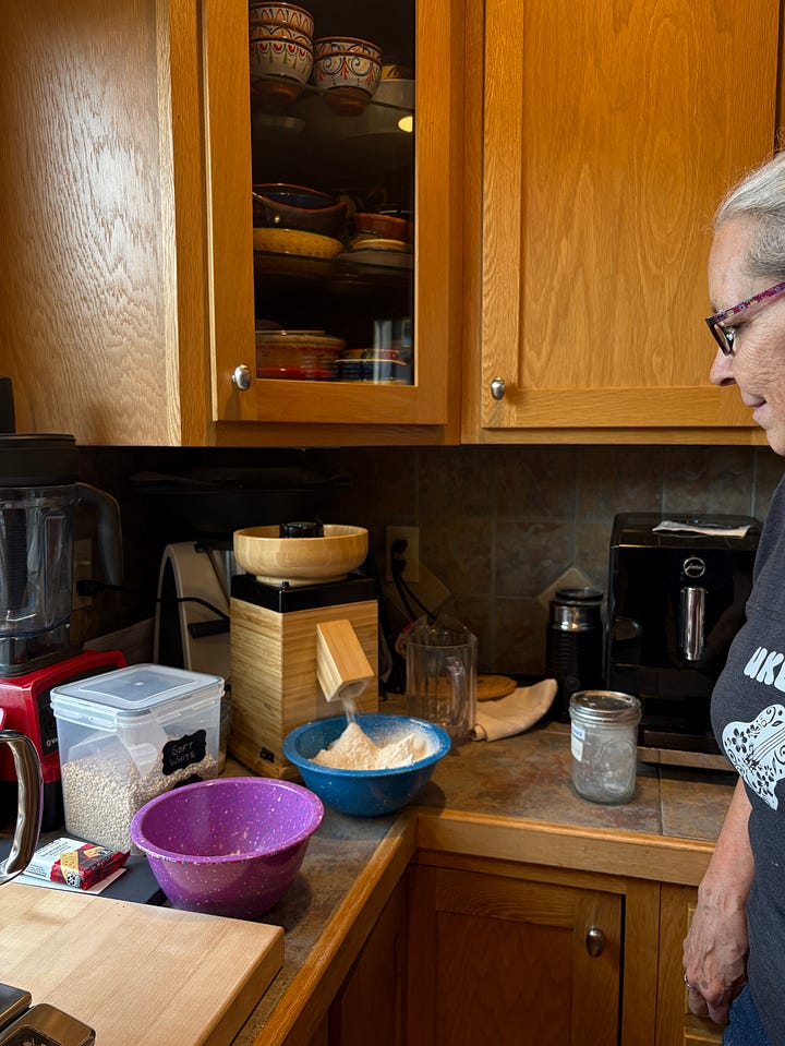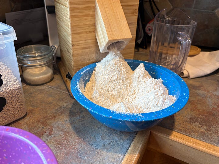As the clock ticked, Joe arrived on time to pick me up and then pick up Lilah at school. On Thursdays, she goes to a math tutor, and I used that hour to text, drop in, and have a quick visit with my bestie from Longmont, Denise. We met when we both taught cooking classes at the local Kitchen Shop, a popular division of the local Ace Hardware. Denise said she was just “puttering” around her kitchen, and when I got there, I heard a small roar. I caught her grinding wheat berries for her sourdough bread, and what she said was her new obsession: Turkish Gozleme, a stuffed flatbread. She is always cooking!