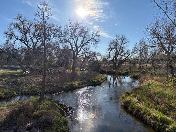On Friday, Joje, Neian, and I walked the paths at Pella Crossing to the heron rookery near the stream to see the nests in the trees. The nestlings are hidden, but the parents make frequent swooping arcs to deliver food. We had hoped to pick up Lilah after school and take her to her favorite little bistro, Cafe Fritz in Hygiene, adjacent to Pella Crossing. But when we picked her up, her flushed face and raspy voice made us realize she needed to go home, have some lemon-and-honey tea, and go right to bed.
