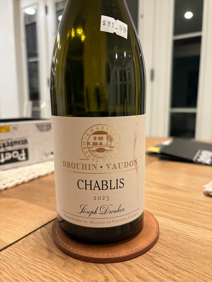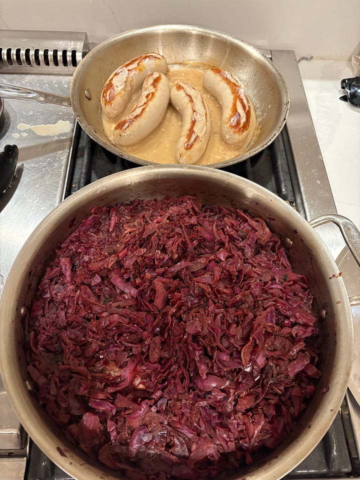 While Neian worked on a big pot of chicken soup, Joe cooked up some Boudin Blanc, and I made Red Cabbage and Apples with Sherry Vinegar to accompany. Joe surprised us with another white Burgundy, from one of my favorite producers, Joseph Drouhin.