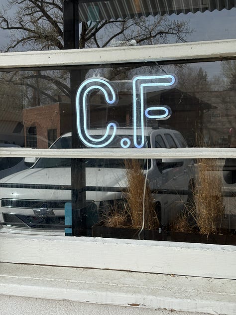 Janet drove me the hour up to Longmont to our son Joe’s house, where the dogs greeted us with manic enthusiasm. After an easy lunch of Easter leftovers—Quiche, Ham, Potatoes au Gratin—it was soon time to pick up Lilah from Westview Middle School. After we collected her, we drove into downtown Longmont for a beverage at a new clothing-and-coffee shop on a Main Street that has upscaled a bit over the past five years. Juniper Goods made delicious beverages, and the store’s eye candy was very tempting. We walked the main drag and visited Simply Bulk zero-waste market, one of my favorite stops when I lived in Longmont from 2017 to 2020. A new independent bookstore, Composition Shop, was where we lingered longest, exploring the well-curated books, games, and stationery.