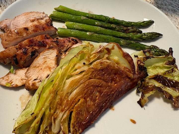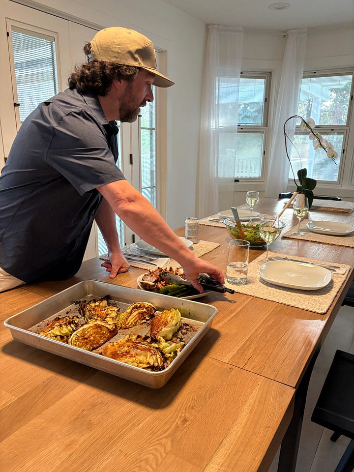 We realized we were approaching dinnertime, and the dogs and people needed food. Neian would be home soon from work and hungry. Joe made dinner in under 30 minutes, grilling some miso-marinated chicken breast and asparagus outside, and popping wedges of cabbage into a hot oven and painting them with a soy-miso-butter paste. As a first-night guest, I got off easy, setting the table. Neian put together a green salad with carrots, and Lilah whipped up a light lemon and olive oil dressing. The Ferrari Carano Fume Blanc we had paired well with the umami overtones of the Asian flavors.