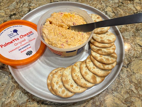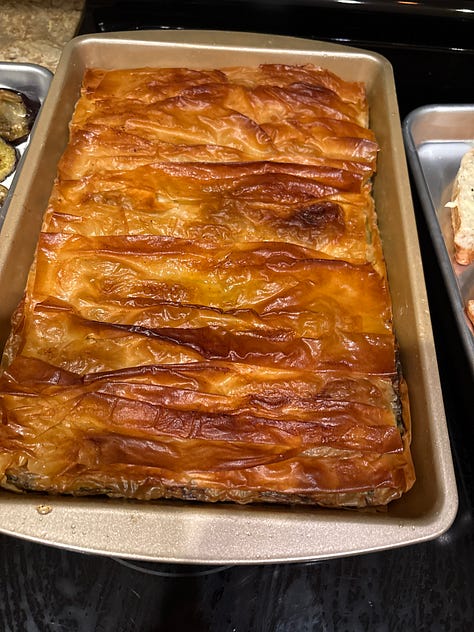 I made a Spanakopita for Friday night when they arrived at dusk, mainly because my sister Mary had made one while I was visiting her, and it looked so good. Pleating the top layer of phyllo made it extra crispy and beguiling. We also had some pimento cheese from South Carolina, widely distributed and highly addictive (right, Jeanne Murphy?).