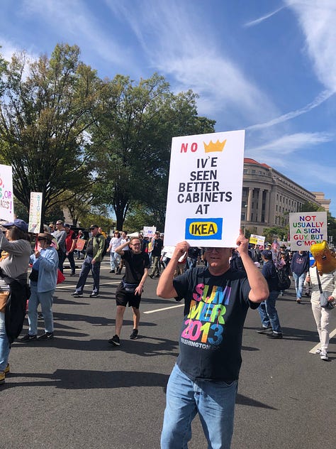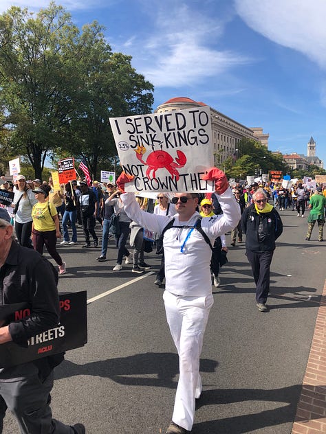 It was a historic birthday, and to celebrate turning 75, I wanted to be part of history. After a very fabulous dinner in a renovated church in Frederick, MD, on my actual birthday with John, my brother, Geoff, and his wife, Barbra, we took the train from Shady Grove into Washington, DC, to take part in the No Kings march the following day. It was a street party with gamely dressed, sloganeering participants—and everyone was courteous and upbeat. The marching and chanting took me back to my youth and the DC protests against the Vietnam War. I felt young again, like I had a voice and it mattered. Like I could change things.