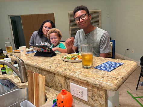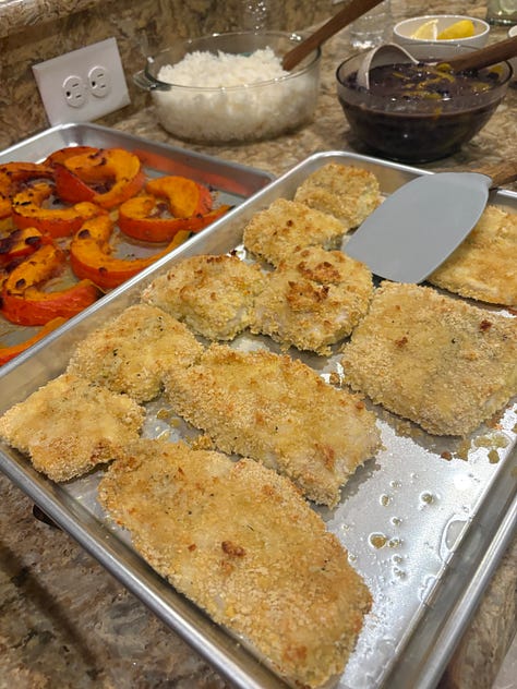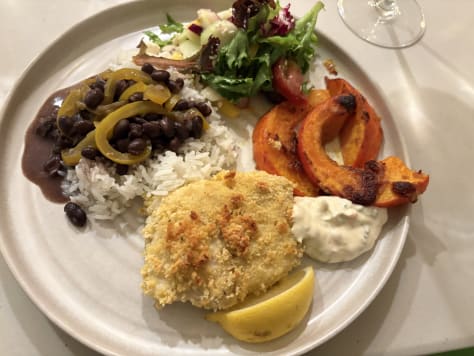 We enjoyed what I call a “proper dinner,” i.e., local fish, seasonal squash, and Mary’s delicious black beans and rice, with a simple salad and a Cilantro Remoulade for the fish. The teenagers, Larissa and Armando, loved it, and CoCo did too.
