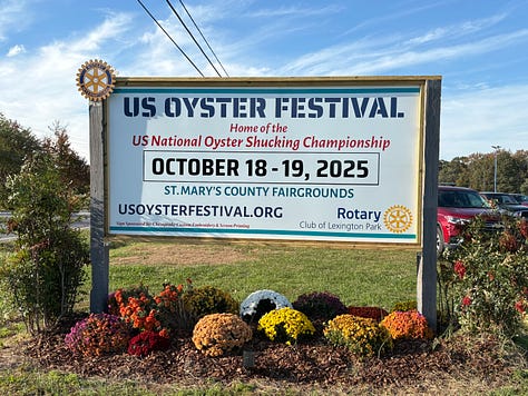 The next day, I headed south solo to Leonardtown, MD, for the National Oyster Shucking Championship with my sister, Mary, her husband, Rolf, and daughter, Brooke, and her SO, Jonathan. There was no oyster cook-off this year, but that event is destined to be resurrected next year for the 60th anniversary. There were still plenty of oysters to slurp, in various iterations, as well as shucked oysters from the contest, served by the participants. It was great fun to see Honor Allen win again—the young man claimed his 6th Top Shucker award—and will compete next September in Galway, Ireland. Here’s a story posted two years ago about the event—and it is pretty much always the same.