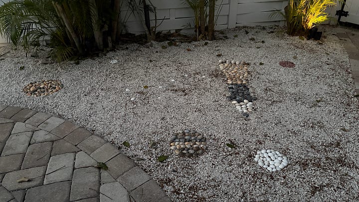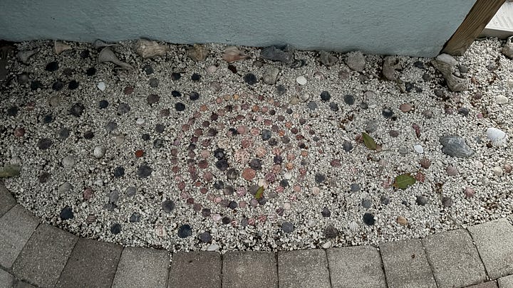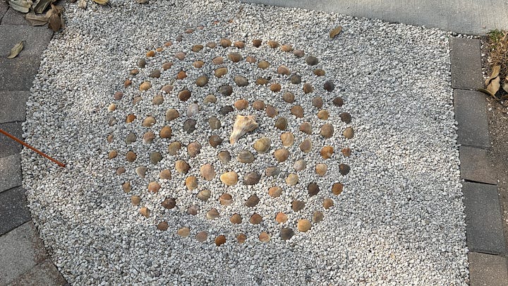 Our time in Cocoa Beach is winding down to the last few weeks. We have learned a great deal, but there is still much more to discover about this intriguing, booming (literally) area. John has been inspired by the beautiful shells on the beach to create “shellscapes” in the yard that have a celestial focus. He’s come out as an artist and enriched the landscape with his designs. Who knew?