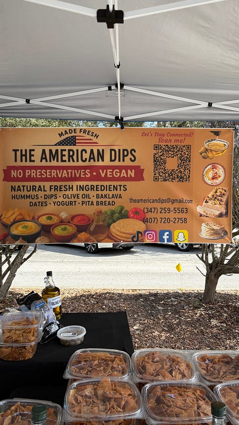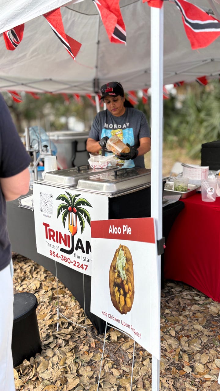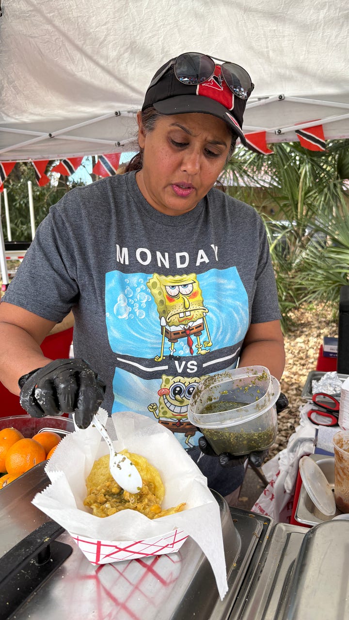 Sunday morning, I headed out for a yoga class and then moseyed over to the local Farmers Market on Merritt Island. My sister Mary had gone the week before and brought several dips for us to enjoy during the Super Bowl. I was already craving them. The market was fun, shady, and full of vendors selling art and crafts. When I was done perusing, I decided to sample some of the food from TriniJam, and that was a good choice.
