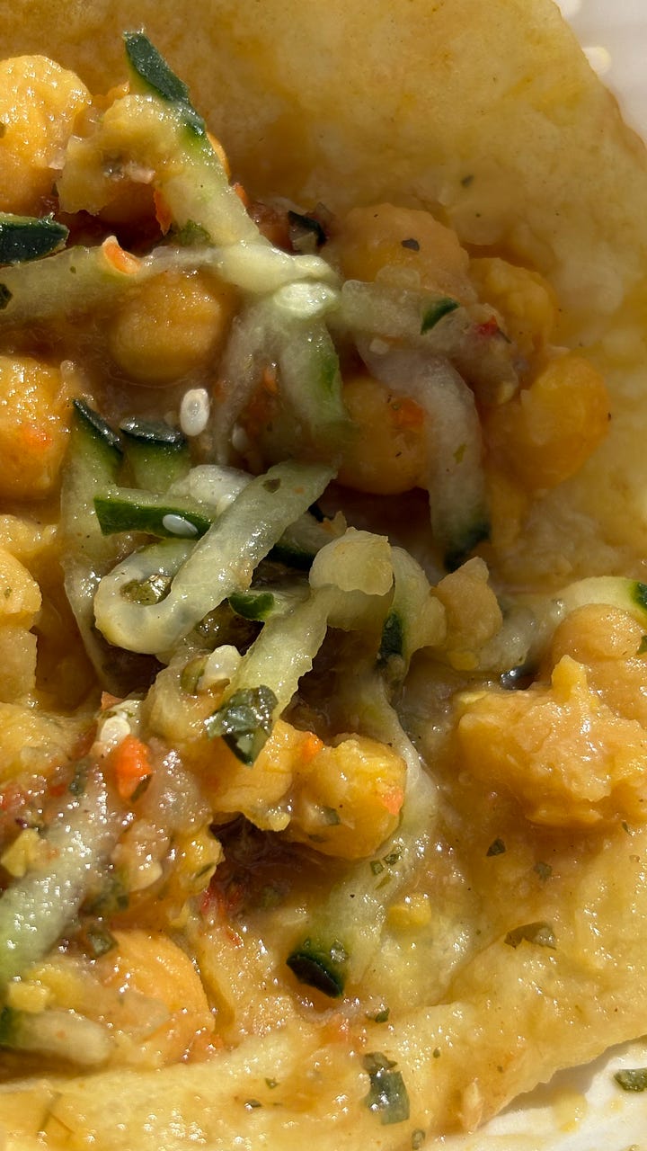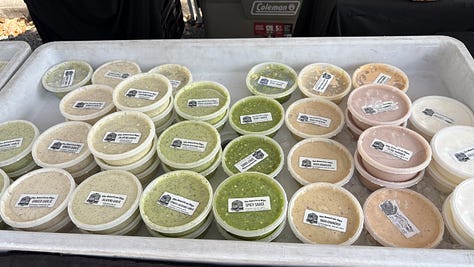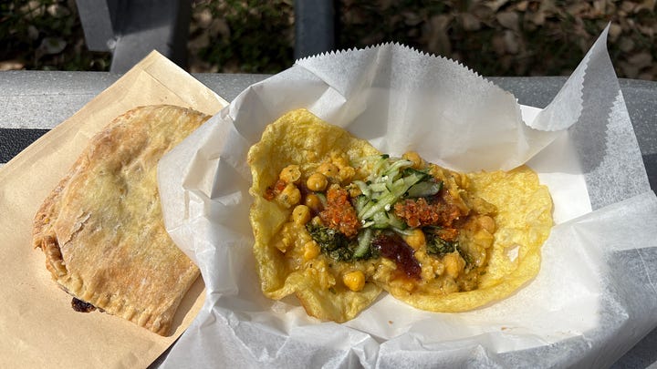 I had heard of “doubles” before, from the Redlands market south of Miami, but didn’t really know the dish. The busy woman at the booth explained that they are a specialty of her country, Trinidad, and the most common type of street food. The base is a flatbread called “bara,” topped with curried chickpeas, culantro chutney, tamarind sauce, pickled cucumber, and Scotch bonnet sauce. It was spicy—but so delicious! I’ll be back next Sunday for more study on this dish—and to learn the pleasant woman’s name. She also sold large, flat patties, and I took one home to John that had a jerk chicken filling. Another reason to return.
