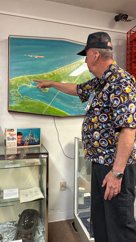 Afterward, we drove into Titusville to visit the American Space Museum and were fortunate to have Eric, a docent who retired after 30 years at the Kennedy Center, lead us through the exhibits. Seeing the map of the launch pads helped make sense of the many rockets we have seen launch into space since we arrived on the Space Coast. There are a lot of them.