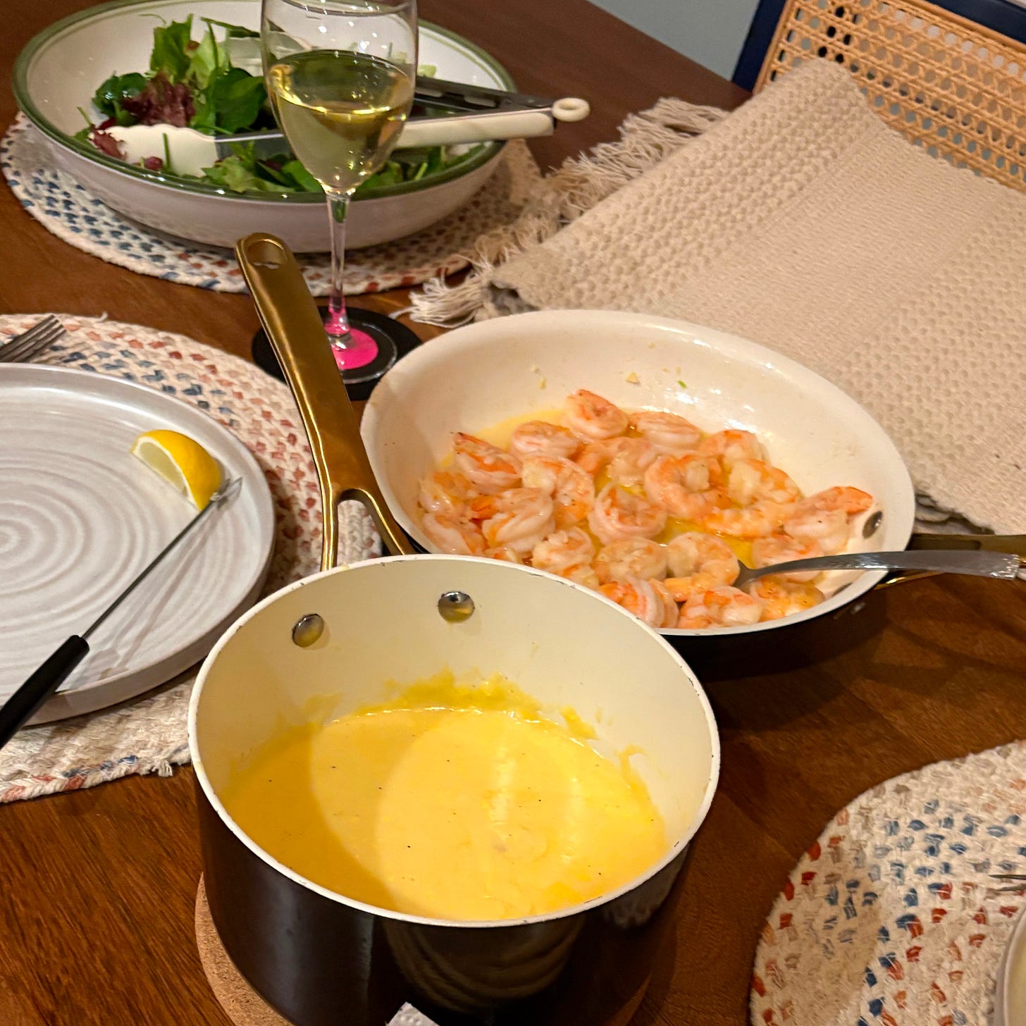 On Valentine’s Day, John and I spent a quiet evening at home, enjoying a fondue, some shrimp scampi, and salad—and my favorite wine variety, Pouilly Fuisse. We didn’t miss the crowds.