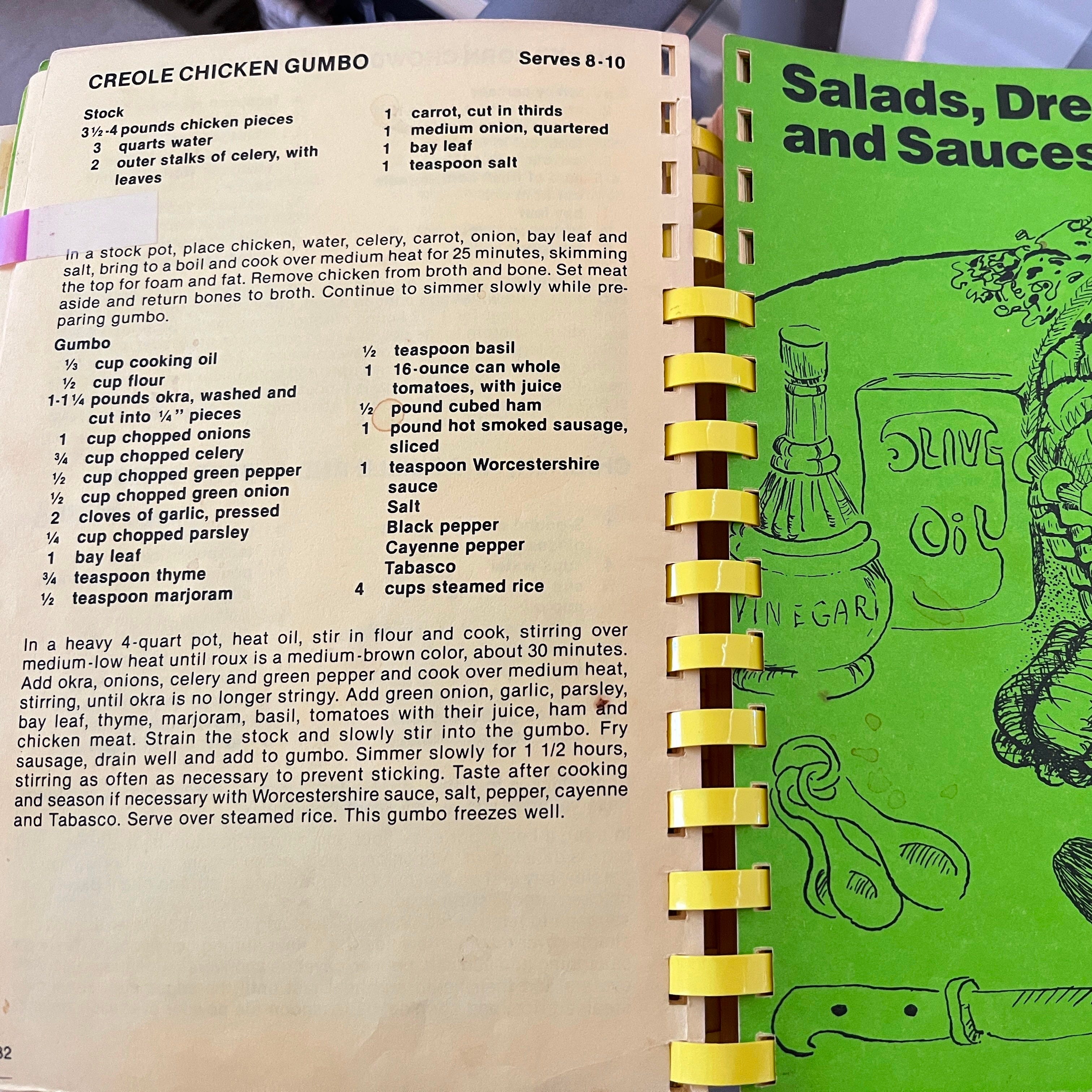 I brought my Jambalaya book back from PA when I was home in January, anticipating the holiday. This book lost its cover long ago, some pages are falling out, and there are multiple tabs on favorite recipes—like this one I will make next week (or a version thereof).