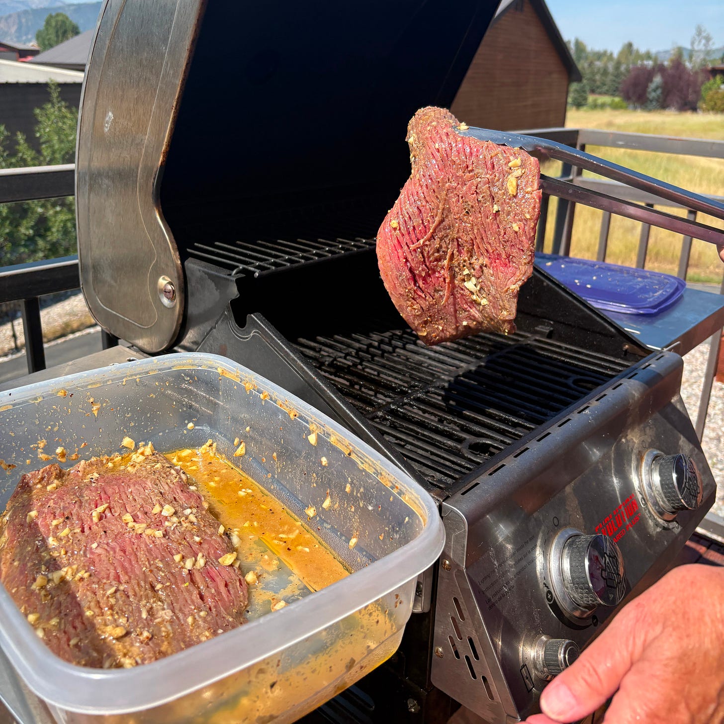 But today, we were lucky. We were invited to a barbecue at our friends Tom and Cynthia Nalevanko’s home, so we were able to enjoy the fruits of Cynthia’s labors, which included a couple of flank steaks on the grill.