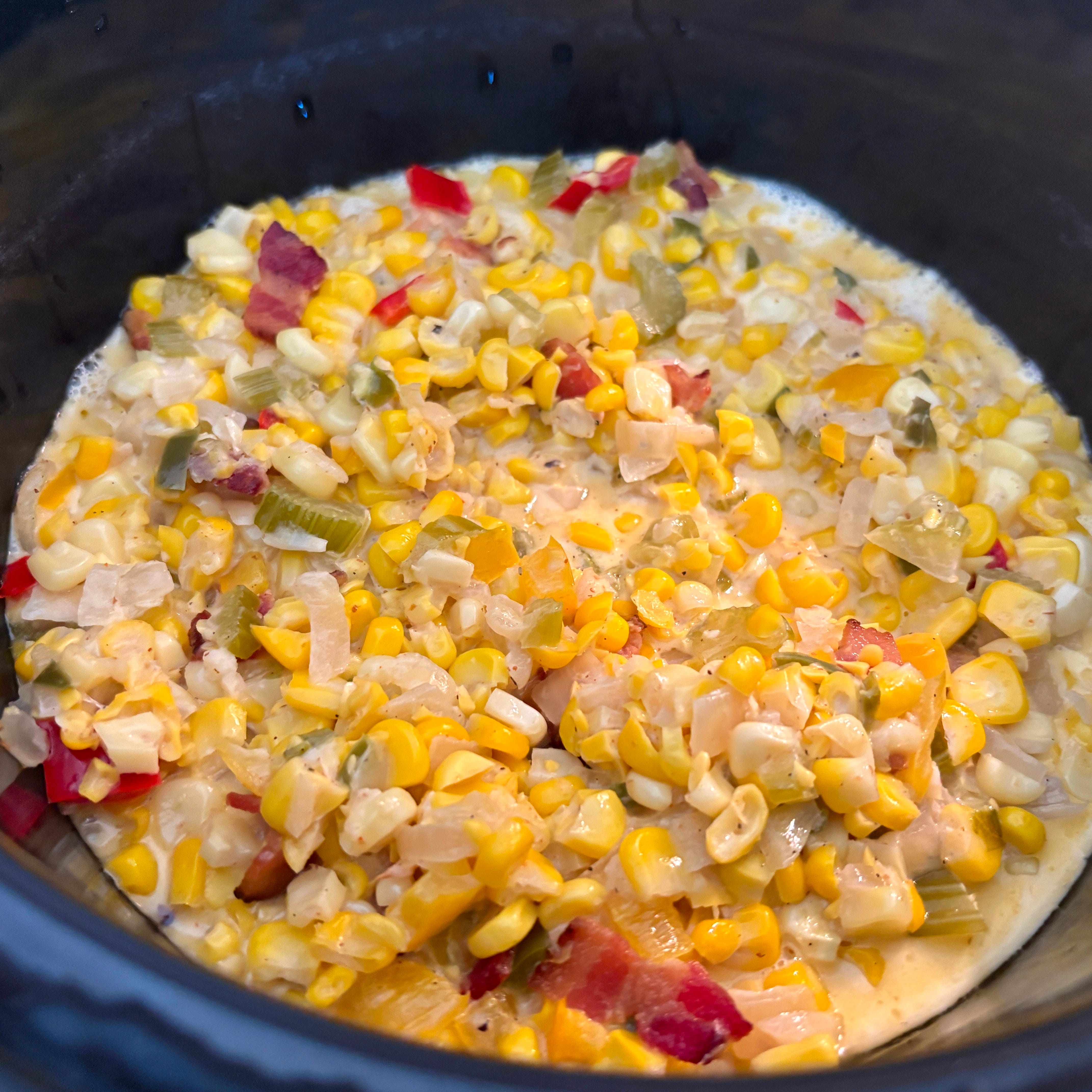 Scraping all those corn kernels off in front of an audience got tedious, but fresh corn is the backbone of the dish. Some recipes call for grilling the corn first, but I typically microwave it in the husk before cutting off the kernels, though even that is not necessary. I do it because the silk comes off easier. Bacon is also a standard ingredient in the dish, as are bell peppers and celery; however, it is really up to what you have on hand. Cream is added at the end—or not.