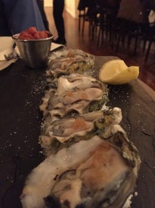 October is National Seafood Month and since it is also my birthday month we celebrated both at Zola's on Saturday night with delicious raw oysters from the Hood Canal in Washington. Briny, crisp and delicious, we ate them with just a squeeze of lemon juice and wondered about who might have been the first person to crack open what looks like a rock and slurp down the delicious morsel inside. As Jonathan Swift said, "He was a bold man that first eat an oyster."