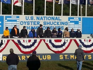 My sister Mary sent photos from yesterday's National Oyster Shucking competition in Leonardtown, MD. Louisiana resident Duke Landry (in yellow), won his second consecutive Championship in 2015 with a composite score of 2:16.76. That's a speedy shucker!
