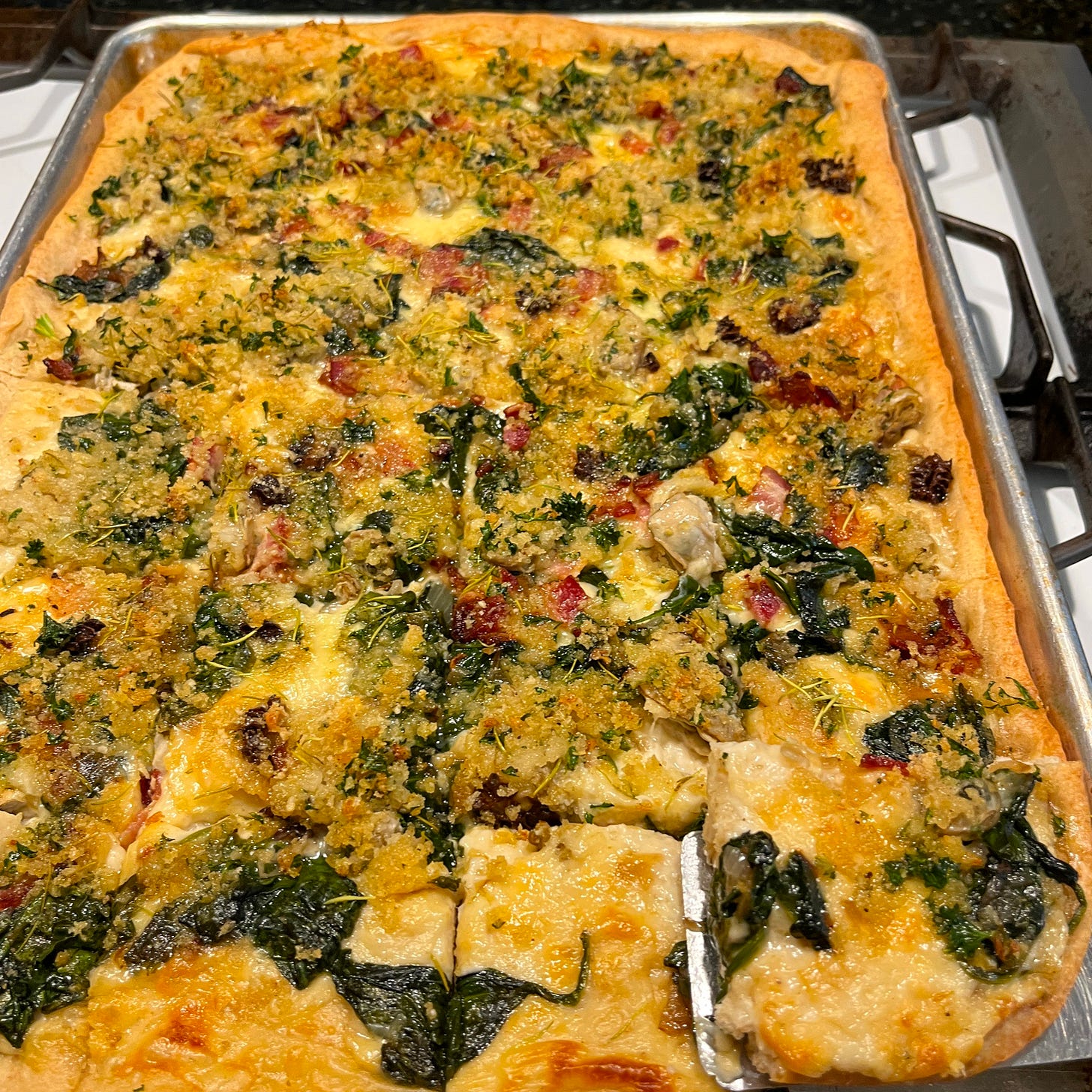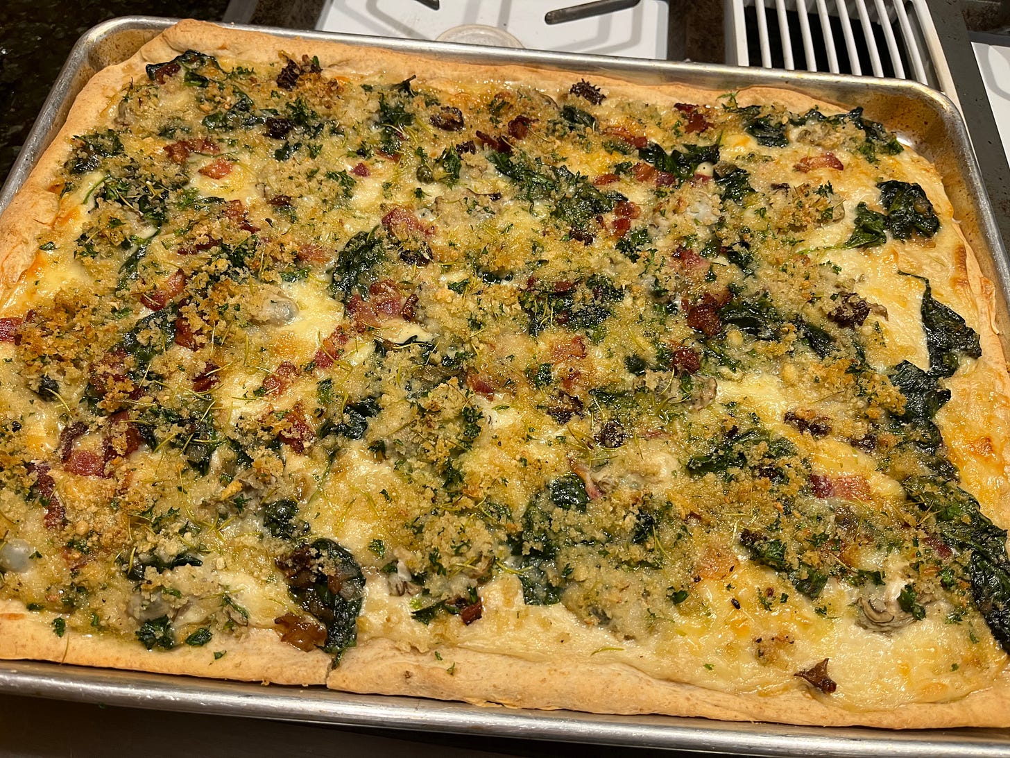 I was hungry for Oysters Rockefeller and thought about how to make that for a crowd, using oysters already out of the shell. Google Oyster Rockefeller pizza and a surprising number of recipes and photos pop up. I did some research and decided to create a new version using my tried-and-true pizza crust recipe from my cooking camp days.
