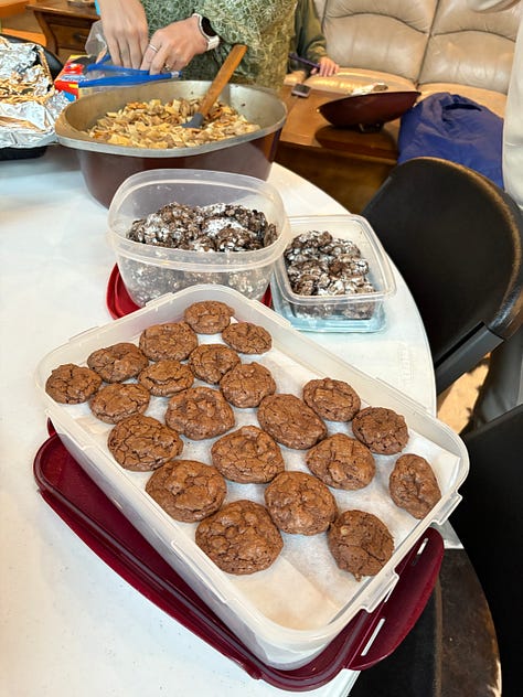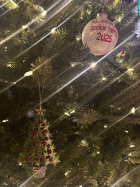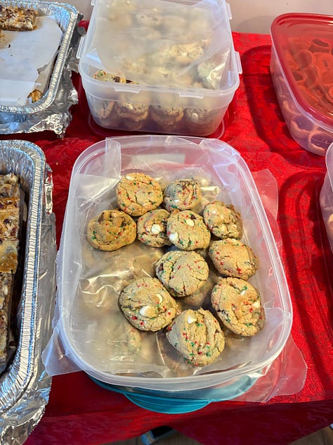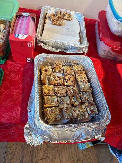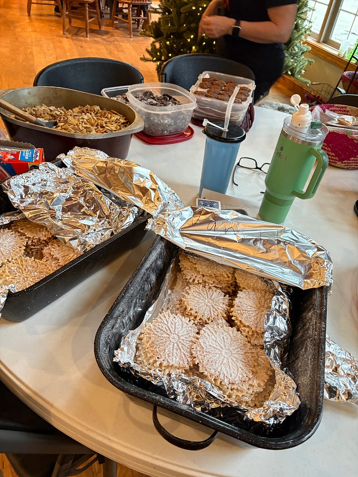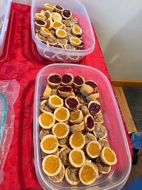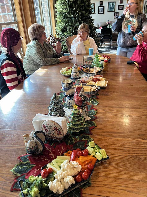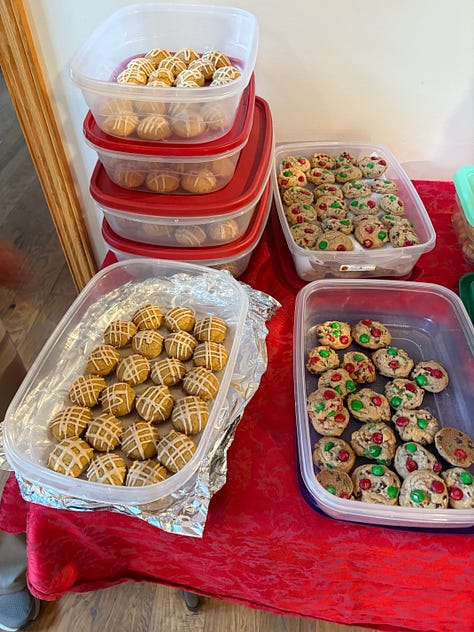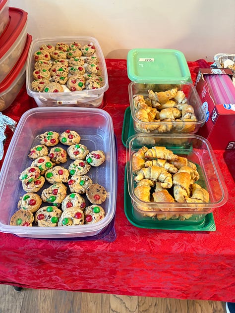 People arrived with six/seven dozen cookies for the exchange, as well as a tree ornament for a gift swap. Folks were also delivering hot food for lunch. Family favorites were the order of the day--haluski, pork and sauerkraut, pierogies, Aunt Sophie’s meatballs made by her daughter Becky, stuffed pepper soup, Buffalo chicken dip—so there were drop-off points around the expansive room for each delivered item. Roasted beet salad, broccoli salad, macaroni salad, roasted peppers, and a big bowl of mixed greens created the salad peninsula. There was food all over the place, including a separate dessert bar with pumpkin pie and raspberry pie, and a cookie tower to distract from the stacked containers of cookies for the exchange.
