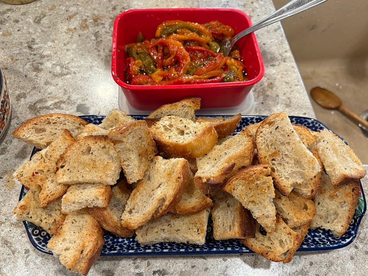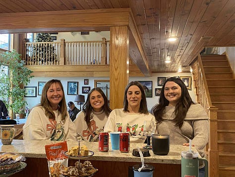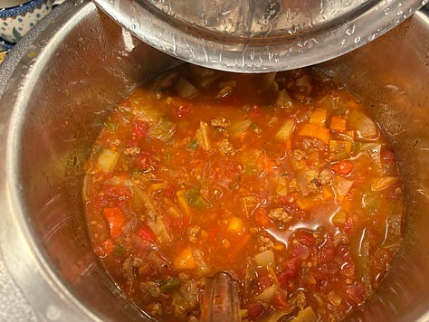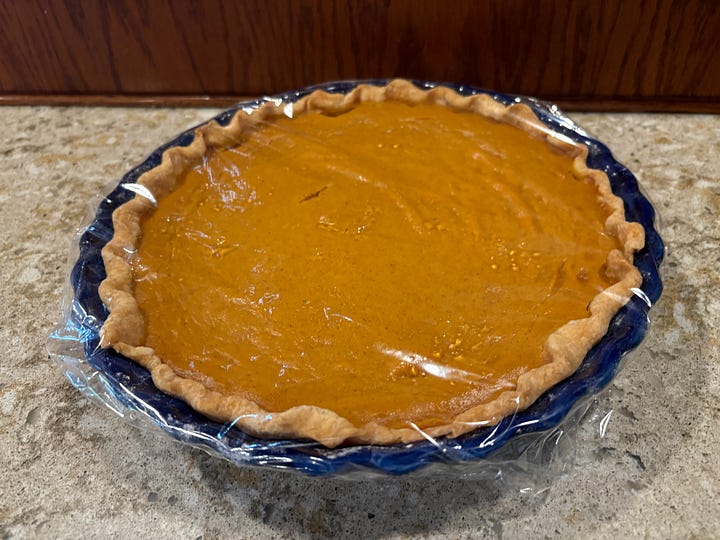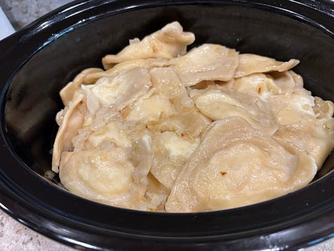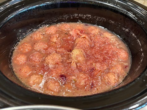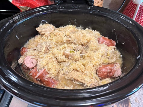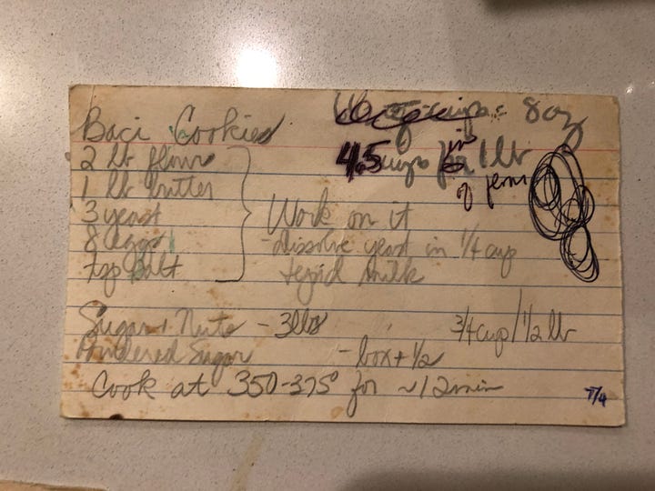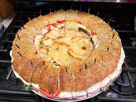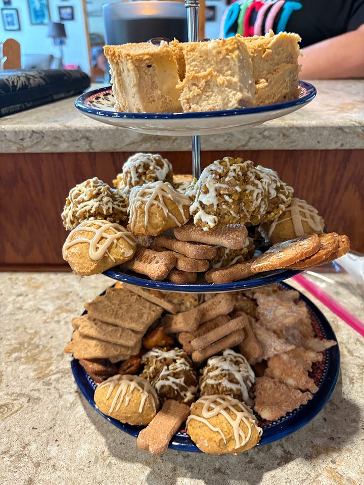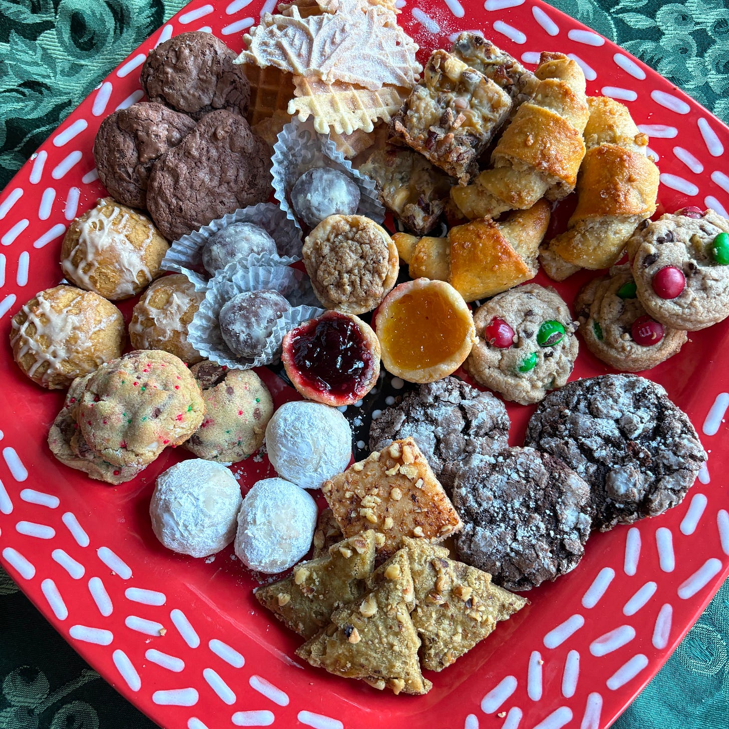 People arrived with six/seven dozen cookies for the exchange, as well as a tree ornament for a gift swap. Folks were also delivering hot food for lunch. Family favorites were the order of the day--haluski, pork and sauerkraut, pierogies, Aunt Sophie’s meatballs made by her daughter Becky, stuffed pepper soup, Buffalo chicken dip—so there were drop-off points around the expansive room for each delivered item. Roasted beet salad, broccoli salad, macaroni salad, roasted peppers, and a big bowl of mixed greens created the salad peninsula. There was food all over the place, including a separate dessert bar with pumpkin pie and raspberry pie, and a cookie tower to distract from the stacked containers of cookies for the exchange.