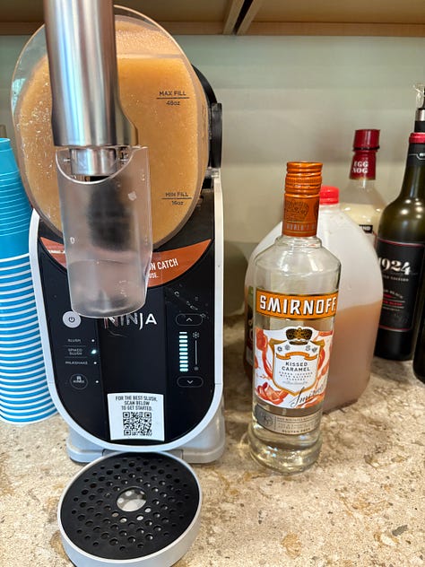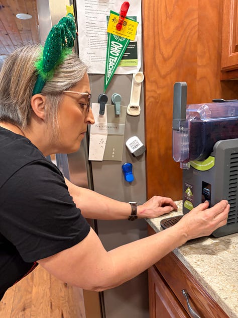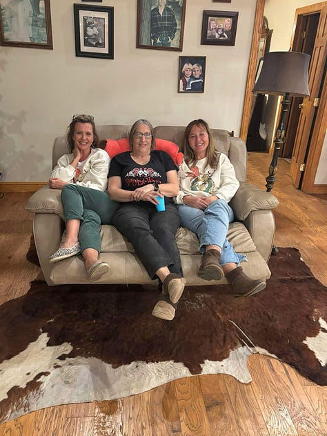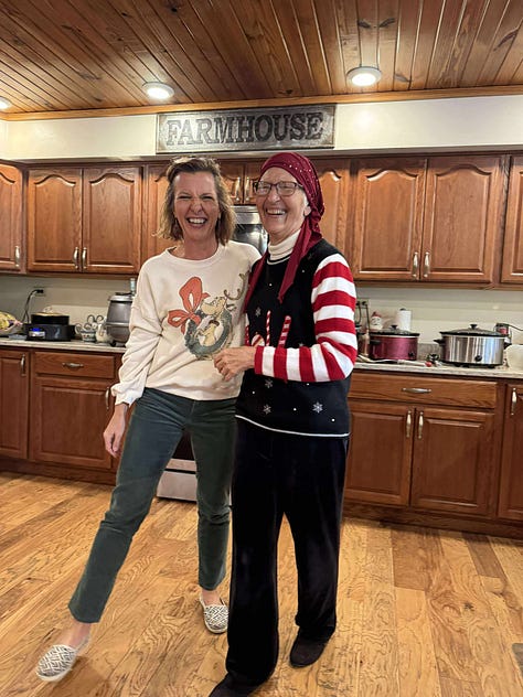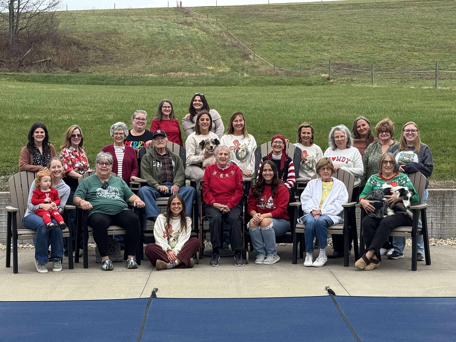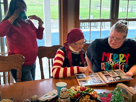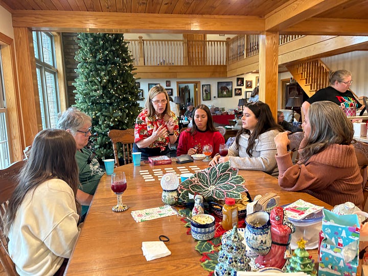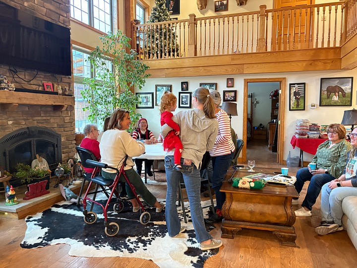 Jodi McFarland hosts the gathering every year with help from her nearby cousins, Kelly and Jamie, daughters of our cousin Barb. Jodi’s energy is remarkable, but anyone who lives on an extensive horse ranch and teaches math at the nearby Belmont College is used to wrangling details. Jodi was simultaneously greeting arriving guests, setting up two slushie machines with adult beverages, arranging hot food on the buffet in the kitchen, uncovering hors d’oeuvres on the dining room table, and herding the excited sheep dogs that wanted in if they were out or out if they were in.