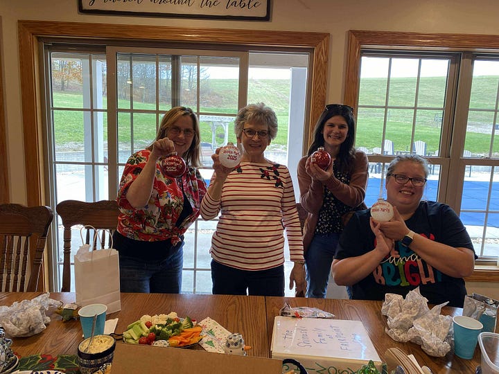 The ornament exchange took place at the dining room table, and we gathered around and followed Chelsea's instructions, who read a right-left version of The Night Before Christmas that cued us to pass the gifts around the table.