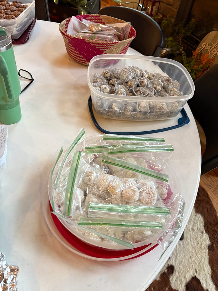 As the sun was going down, we set out the cookies, and everyone picked six of each variety to pack up and take home. Containers that were quickly depleted were replaced until everyone had filled what they had brought to deliver their cookies in.