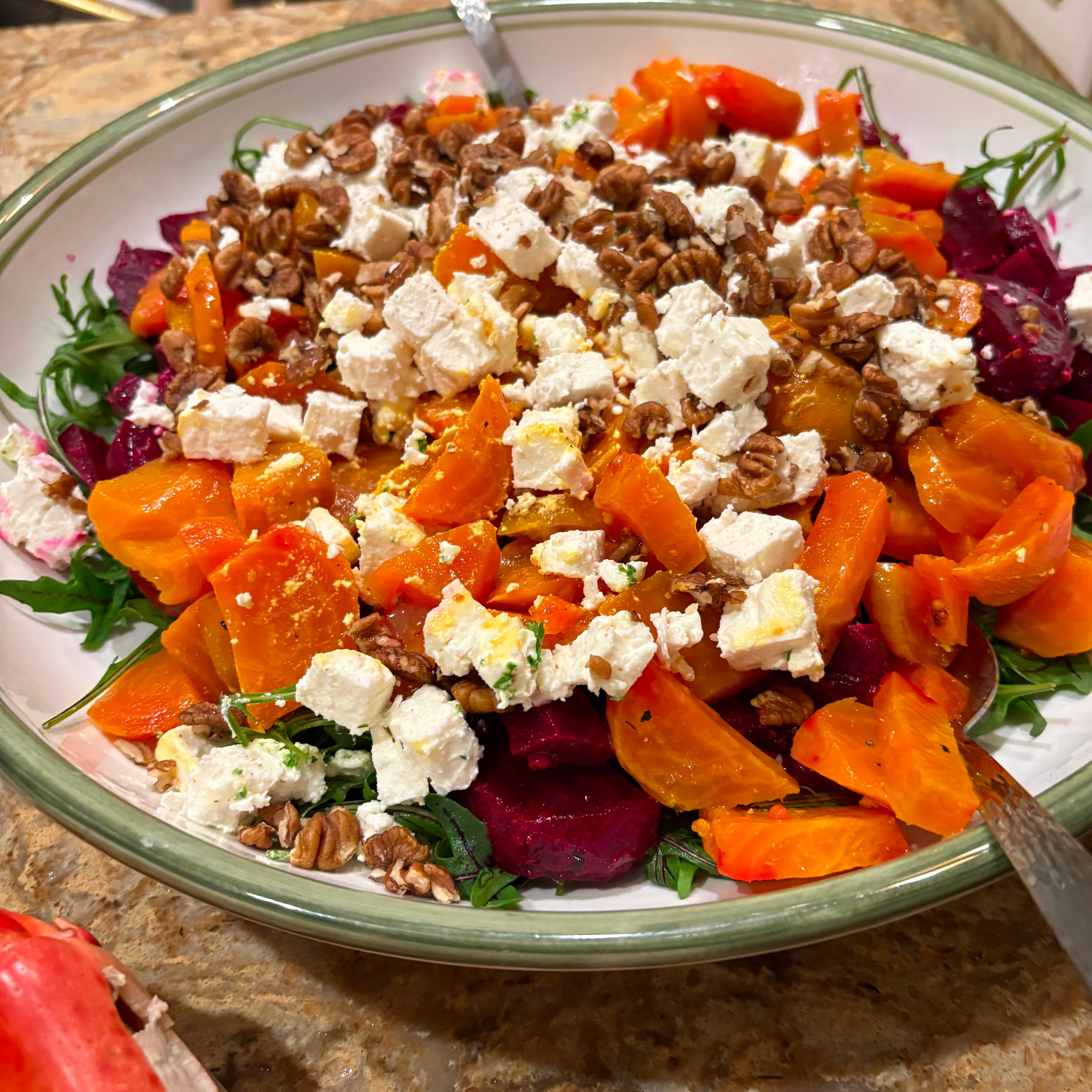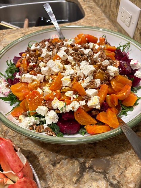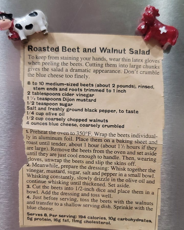 I had time to think about what the menu might be for Christmas dinner, and also to check in with family to see what was cooking. My sister Mary sent our Mom’s recipe for a roasted beet salad that would be perfect for our feast, with a switch from blue cheese to feta and from walnuts to hickory nuts. What you have is what you get.