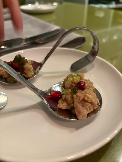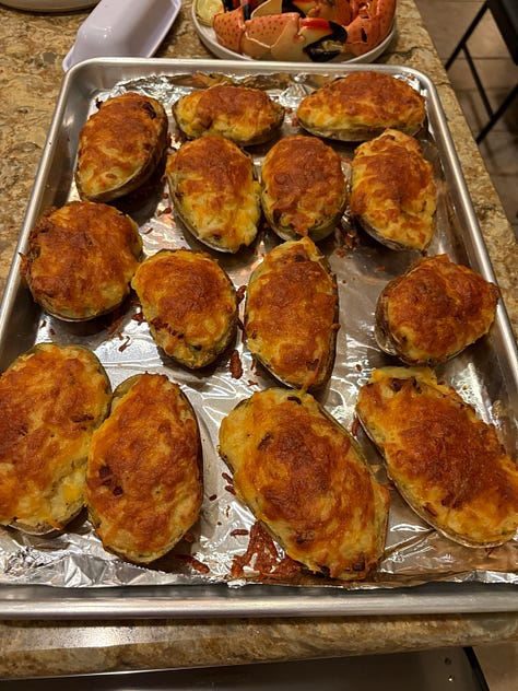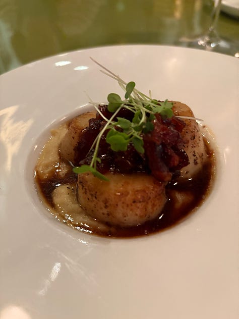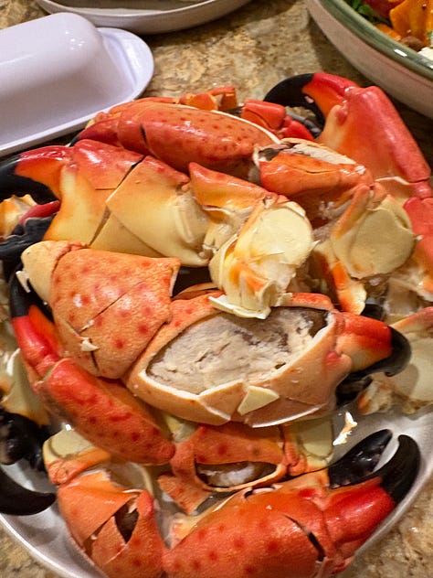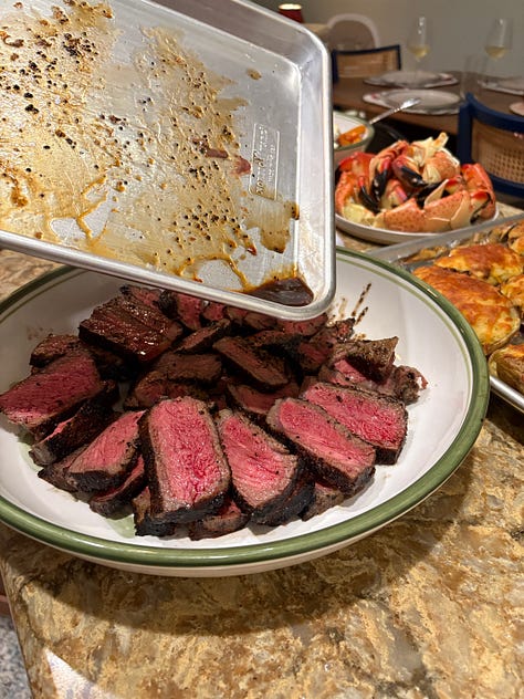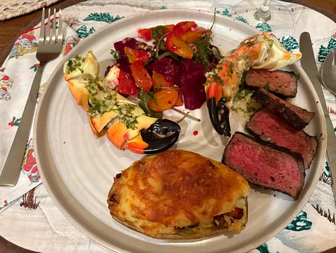 The last four Christmases we celebrated in Wyoming, and prime rib was the main course for Christmas dinner. I knew that Al would be bringing up his stone crab claw harvest, so I wanted to have some red meat, but not that much. I did some recon Monday morning and decided to consult with the principals about the main—that would be Mary, as we were joining her table. She liked the idea of steaks, so I went back in on Tuesday and encountered a big line. At least they were handing out samples of their prime rib along with mashed potatoes and a smear of horseradish cream. That’s the way to sell.