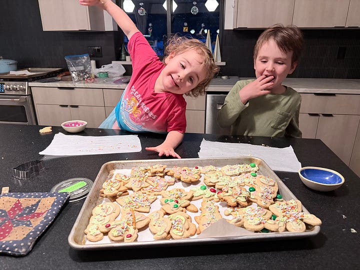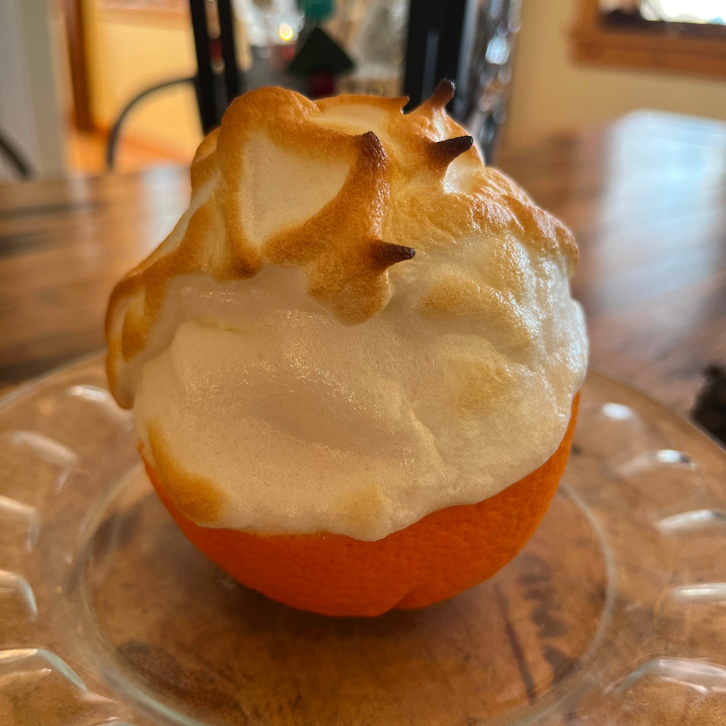 My only disappointment was that I messed up my favorite Christmas dessert, an Orange Baked Alaska, but you can read how to make it here. I used a carton of egg whites, thinking it would simplify the process and save me from having to incorporate six egg yolks somewhere. But my meringue was not very firm and slid off the ice cream. Here is a photo of what it should have looked like—though the shlumpy versions were tasty, too. No photos; I was too depressed.