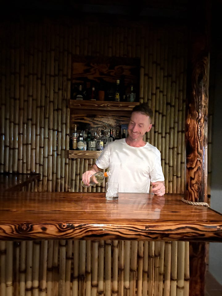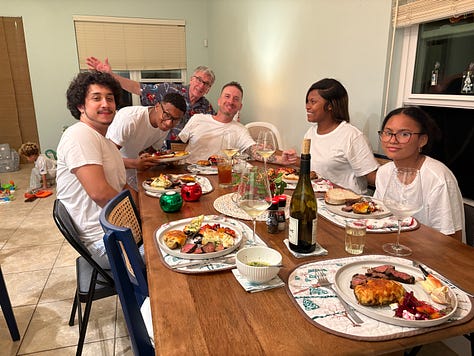 Then it was time to hustle Christmas dinner to the table. The crab claws were easy; Mary made her delicious garlic butter with lemon and parsley. The steaks needed only some seasoning and then a sear in a cast-iron pan before finishing in the oven (there is no grill at Casa Coco so don’t plan on any barbecuing if you come). Only we set off the smoke alarm, which lent an air of festive panic until Al vaulted up to reset it. The ceilings are high.