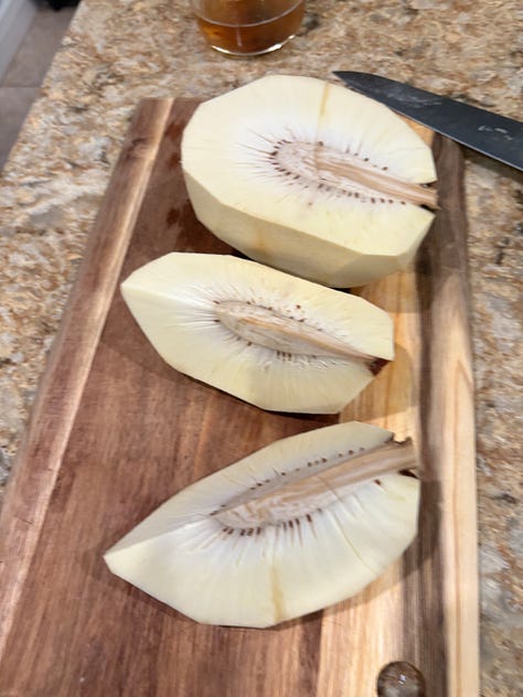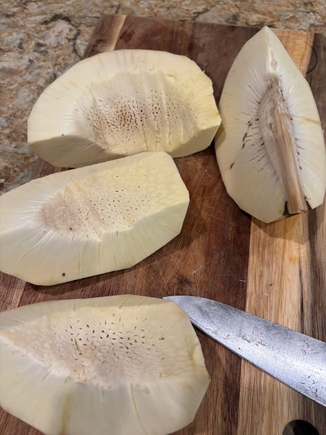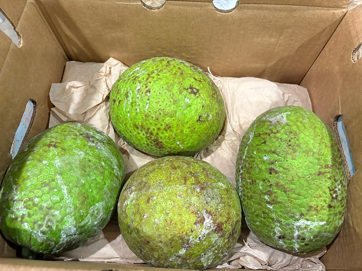 That afternoon, we found a box on the doorstep that was supposed to have arrived weeks earlier. Soon come, mon. A case of breadfruit that Alex had ordered for the holidays finally arrived, forcing us to think outside the box about how to use it.
