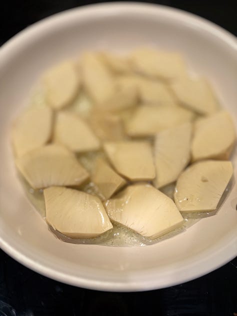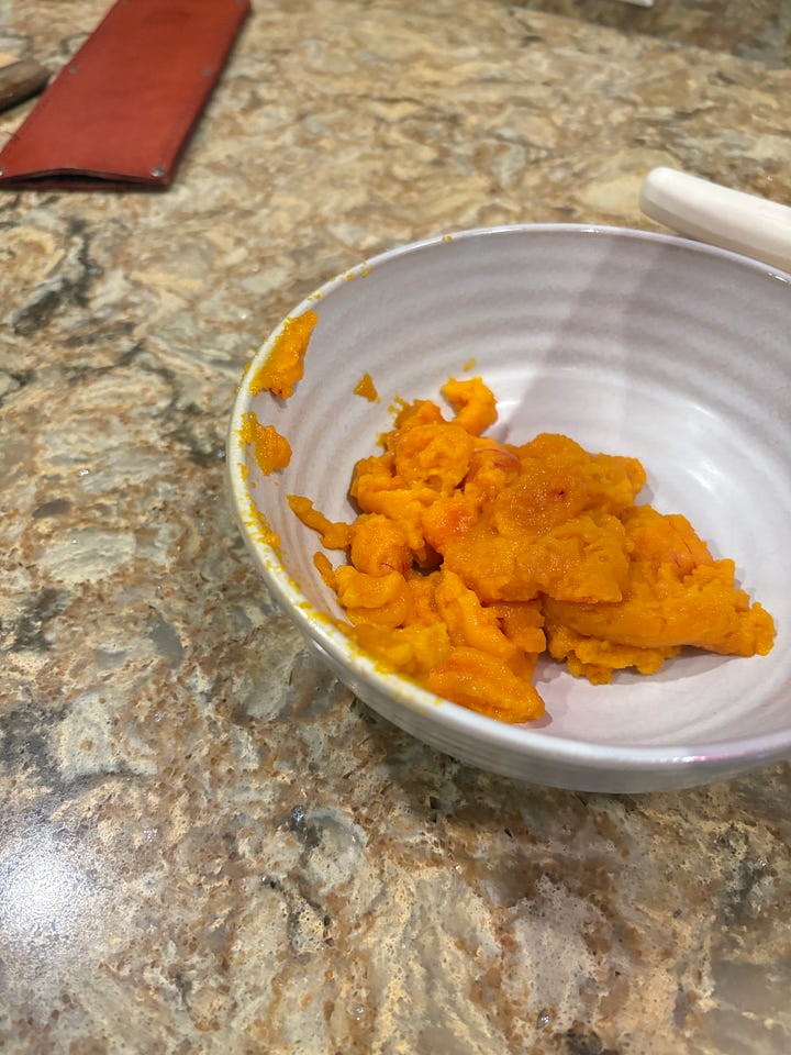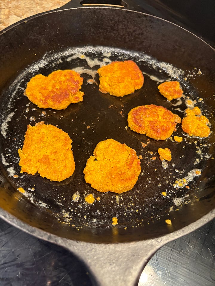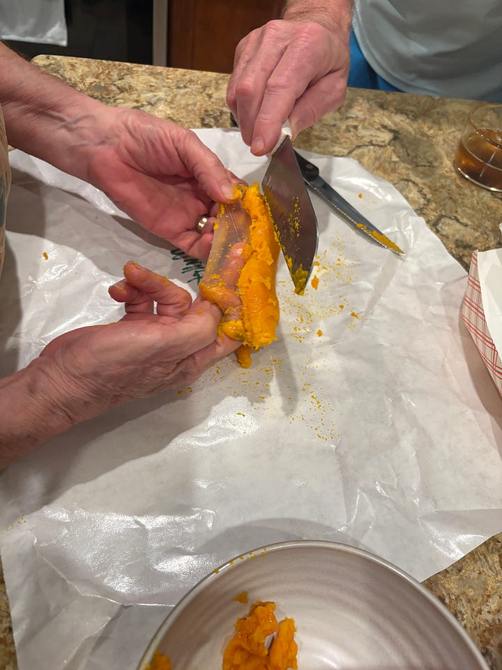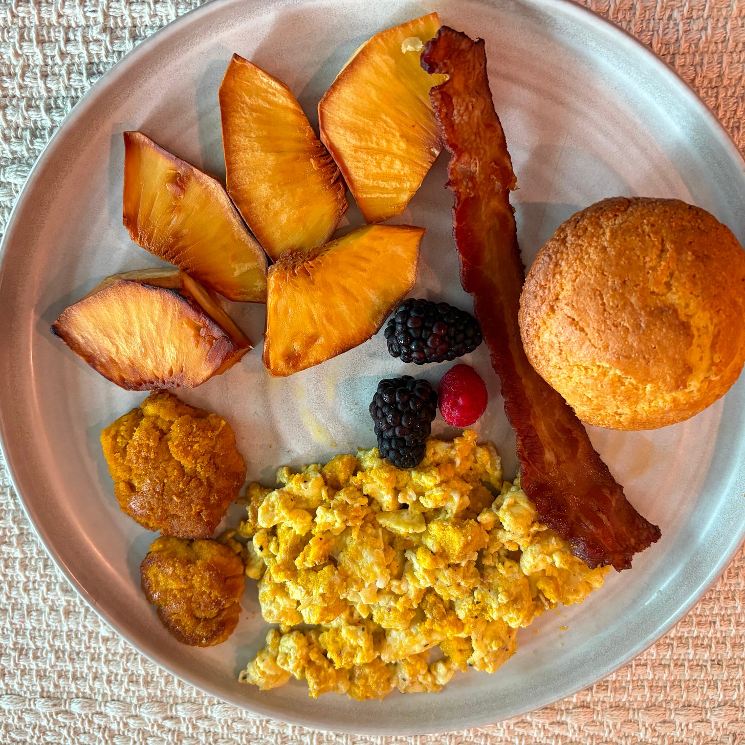 After checking out and running home from the still-cold beach in the morning, we got experimental. While the oven was on the night before, I roasted one of the breadfruits for 2 hours, until a knife could be easily inserted. John peeled it in the morning, and then I trimmed out the core and sliced it to fry up. Barbra was busy cleaning the eggs out of the mullet roe sacs to make little patties that the ladies at the seafood market told us about. We tried the mullet patties—salty, fishy, grainy—and decided to add them to scrambled eggs and that was a winner. For some. It was a rootsy breakfast with some corn muffins.