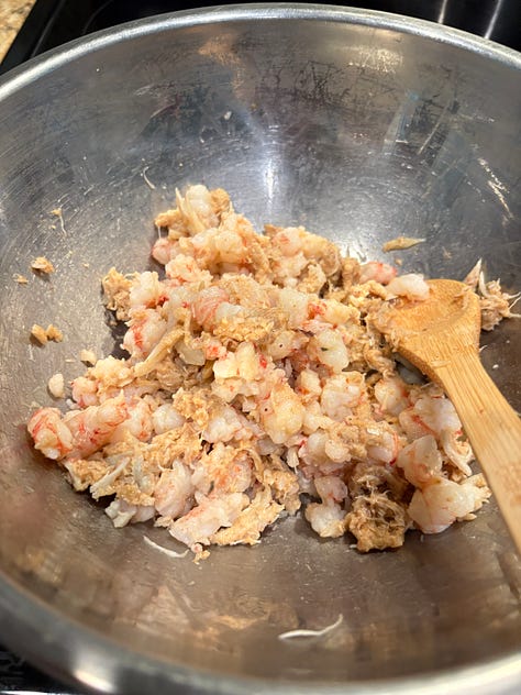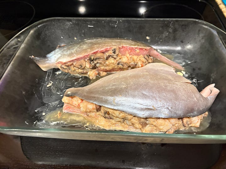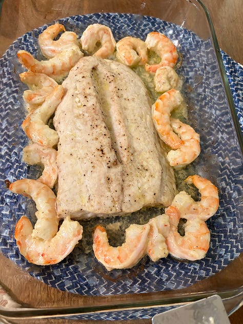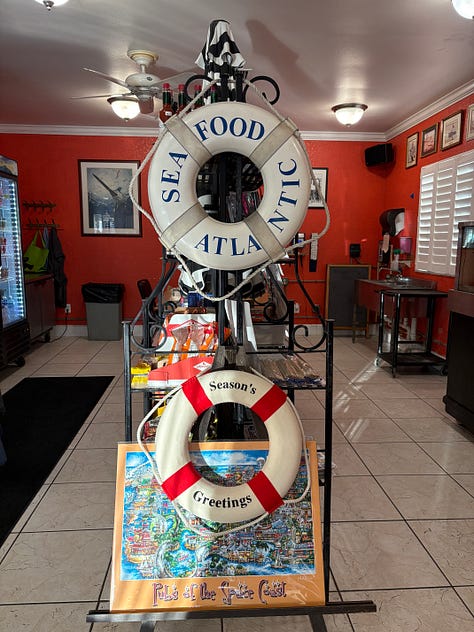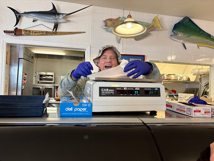 Since it was Geoff and Barbra’s last day, we went up to Seafood Atlantic, where John, behind the counter, helped us purchase dinner—pompano, and rock shrimp to stuff it with. A perfect combo!