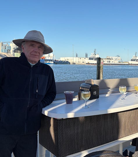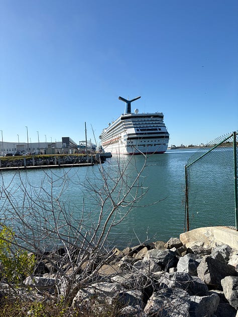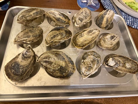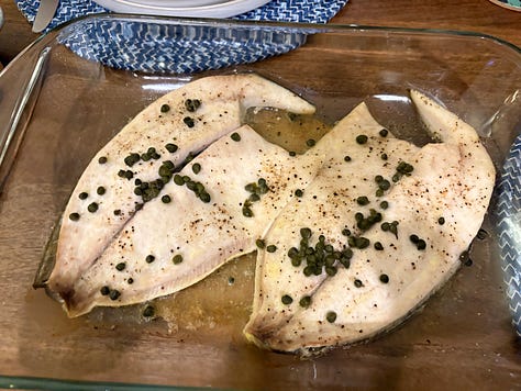 We went up to Port Canaveral to watch the cruise ships sail out on Friday evening, having a glass of wine on the dock behind Seafood Atlantic, our favorite seafood market. We purchased some Sebastian Inlet oysters there, and some local pompano for dinner. Barbra declared that the pompano was the best fish she had ever tasted—and I did not disagree. Prepared simply, just brushed with olive oil and seasoned with salt and pepper and then topped with some capers, the fish cooked in about 15 minutes, the same amount of time it took to roast the oysters. Dinner in under half an hour? Yes, thank you!