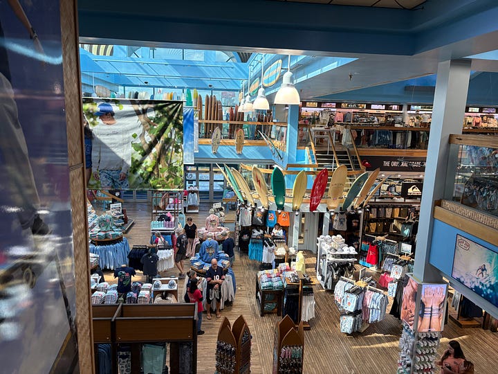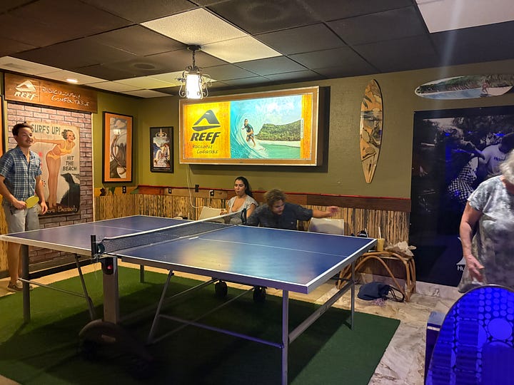 Once we finally headed into town, we needed more coffee and went to Surfinista right on the main drag in Cocoa Beach. This coffee and surf shop has a pingpong table in it, and Barbra challenged one of the players to a game while waiting for her latte. She lost, but we had fun cheering her on in the lively shop. We headed over to Ron Jon’s, the iconic surf shop that put Cocoa Beach on the map (or was that I Dream of Jeannie that put Cocoa Beach on the map?). It was quite a tourist destination and we don’t have to go there again—unless we have more visitors.