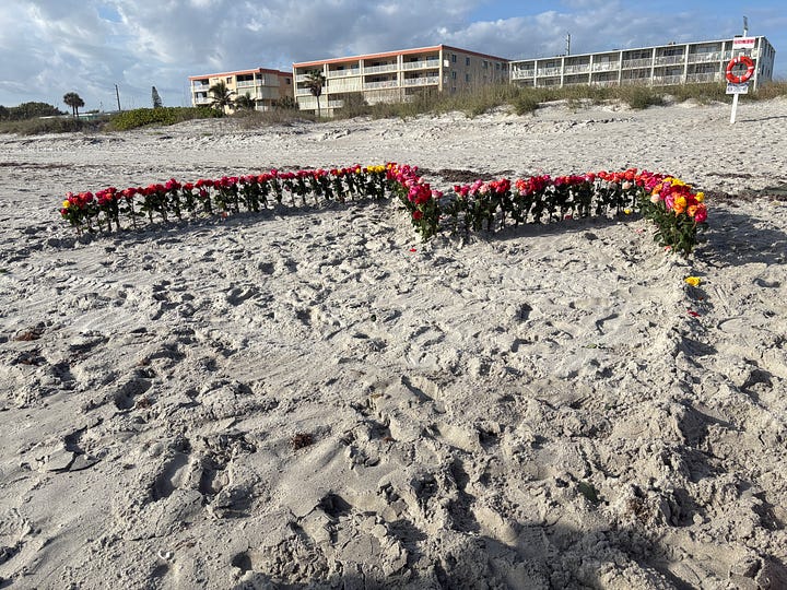 But we walked on the beach in the morning, seeing this display of roses. When we asked the woman setting it up what it was about, she said her cousin died and that this was her heartfelt message of love and loss. How coincidental, and sad, when we learned later that day that we too, my brother and I, lost our cousin Philip Shinoski at age 56. Life is short. We try to make every day count.